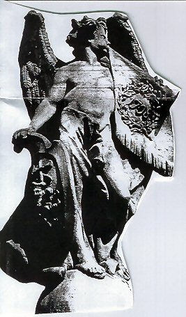 Gerüchts. Rechts hält Fama das Wappenschild der Stadt