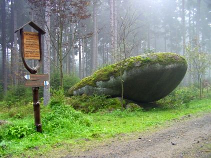 Der Nachbar war ein alter, in allen schwarzen Künsten, Hexenaustreiben, Schatzheben usw. wohlbewanderter Mann der meinte: “Leg dich heute Nacht ruhig nieder; wenn wieder jemand ruft, so steht auf, klopf an mein Fenster! Wir spannen alsdann ein und fahren in Gottes Namen. Aber keiner darf reden, nicht ein Sterbenswörtlein, sonst ist`s gefehlt!“. Das feine Stimmchen rief zum dritten Male. Schnell sprang der alte Färber aus dem Neste, weckte den Nachbarn, spannte die mageren Kühlein vor seinen alten Wagen. Da kam auch schon der Nachbar. Sie setzten sich auf den Wagen, keiner sagte ein Wörtlein, nicht muh und nicht mäh. Und die Kühe zogen an, fort ging`s in die dunkle Nacht hinein, grad dem tiefen Brunnen zu. Dort angekommen, hielten die Kühe von selber an. Und richtig! Da lagen zwei schöne Fässchen neben dem Brunnen. Diese waren aber schwer, so schwer, dass sie die Riegel vom Wagen nehmen mussten, um auf ihnen die Fässlein hinauf zu rollen. Ein schweres Stück Arbeit. Sie schnauften und schwitzten, aber es ging doch. Nur noch oben hineinheben mussten sie das erste Fass, also fest zugreifen. „Ho ruck“ rief in üblicher Gewohnheit der Eine. Da entglitt das Fässlein ihren Händen, rollte hinunter, stieß an das zweite und alle beide fielen plumps hinein in das tiefe Wasser. Es war ihnen, als hörten sie noch ein helles, schadenfrohes Kichern. Betrübt und schimpfend fuhren sie wieder heim. Oftmals sind die beiden mit der Hacke in den Wald gegangen, ein dürres Bäumlein zu holen. Immer führte ihr Weg zum tiefen Brunnen. Oft meinten sie, sie müssten die Fässlein wieder sehen, aber immer vergebens!“ Soweit die Sage im Volksmund. Einen Hinweis auf sagenhafte Schatz- und Goldvorkommen im südwestlichen Kösseinegebiet gibt uns Johann Christoph Pachelbel in seinem 1716 erschienenen Buch „Ausführliche Beschreibung des Fichtel-Berges in Nordgau liegend...“, wo er auch die Aufzeichnungen der alten Venediger wiedergibt. Pachelbel schreibt: „Frage ferner zu Ebnath nach dem Hundsbach, der bey Ebnath und bey Reichenbach herabfällt, der soll auch von der Cößein kommen. Nun liegt die Cößein zwischen Ebnath und Waldershof, wer den rechten Weg weiß, der kommet durch die Cößein, darunter wird der Ursprung des Hundsbaches nicht weit davon seyn. Von diesem Hundsbach wäre viel zu reden, welcher aus Nürnberg seinen Reichthum allda geholet, der zuvor arm war. An diesem Hundsbach nun gehe hinauf, bis er entspringet, daselbst siehe dich umb nach einer Tannen, daran ein Zeichen, wie ein Buchstab oder eine Hand. Darunter ist ein Stollen oder Höhle mit einem großen Stein verdeckt, den thue auf, darinnen findest du einen gelben Gold-Gang und im Waschen gediegene Gold-Flammen....Dieser Hundsbach hat seinen Ursprung auf dem Pfälzischen. Aufgrund der Aufzeichnungen von Hauptlehrer Schuster und Pachelbel kann heute noch der Ort der sagenhaften Gold- und Schatzfunde lokalisiert werden. Dem geschätzten Leser dieser Zeilen wird nun das Geheimnis gelüftet! Es handelt sich um ein ruhiges Waldgebiet, das sich da am Südabfall der Kösseine ausbreitet. Es sind dies u.a. die Waldungen der Forst Ebnath AG . Nur wenige markierte Wanderwege durchqueren es, Forstbetriebswege laden dennoch zu ausgedehnten Spaziergängen ein. Wir befinden uns hier bereits auf Oberpfälzer Gebiet, denn am Süd hang der Kösseine verläuft die Grenze zwischen den bayerischen Regierungsbezirken Oberfranken/Oberpfalz. Betrachtet man die topographische Karte oder unsere Wanderkarte, kann man feststellen, dass dem Südhang der Kösseine mehrere Wasseradern entrinnen. Im südwestlichen Bereich finden wir den Ochsenkopfbach, Hundslohbach (!) und Kösseinebach. Wenige hundert Meter nördlich von Unterschurbach vereinigen sie sich zum Höllbach. Dieser wiederum mündet nach munterem Lauf bei Riglasreuth in die Fichtelnaab. Da wo der Hundslohbach entspringt befindet sich die Waldabteilung Hundslohe, jene Gegend, die 1716 schon von Pachelbel genannt wird und auch der Sage vom tiefen Brunnen zugeordnet werden kann. Auch der von Hauptlehrer Schuster genannte „Edelmannsstein“ ist noch vorhanden! Wir bezeichnen ihn heute als „Wackelstein“. Er ist ein riesiger Felsblock von etwa 1000 Zentnern Gewicht, liegt nur auf einer kleinen Grundfläche auf und lässt sich mit einem Holzriegel in gewaltige Schaukelbewegungen bringen, ohne dass er von seinem Sockel stürzt. Und um diesen „Wackelstein“ herum findet man die verborgenen Goldvorkommen und Schätze! Viel Glück beim Aufspüren derselben!