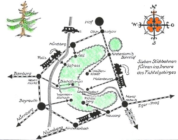 Die Eisenbahn im Fichtelgebirge Im Jahr 1840 entschließt sich der Bayerische Staat, von München über Nürnberg und Bamberg nach Hof zur Landesgrenze nach Sachsen eine Staatsbahn zu bauen, die 1848 fertiggestellt ist und zu Ehren des bayerischen Königs „Ludwig-Süd-Nord-Bahn“ genannt wird. 1864 wird die Strecke Regensburg – Weiden – Wiesau - Eger (1882 Wiesau – Marktredwitz) und 1865 die Strecke Oberkotzau – Rehau - Selb-Plößberg - Asch - Eger fertiggestellt. Das Fichtelgebirge ist zwar dadurch an den Randgebieten verkehrsmäßig erschlossen, das Gebirgsinnere bleibt bezüglich des Eisenbahnverkehrs ausgesperrt. Die Bewohner müssen erst weit entfernte Bahnhöfe zur Weiterfahrt erreichen. In den Fichtelgebirgsorten bilden sich Interessengemeinschaften, die zahlreiche Ein-gaben und Vorschläge unterbreiten und um einen Bahnanschluss regelrecht kämp-fen. Erst als 1878 die durchgehende Strecke Nürnberg-Schnabelwaid-Neusorg-Marktredwitz- und 1877 Oberkotzau-Holenbrunn fertiggestellt ist, können auch in das Fichtelgebirgsinnere folgende Stichbahnen gebaut werden: