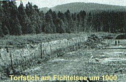 Die wichtigsten Torfabbaugebiete waren: Breitenbrunn (Ortsteil von Wunsiedel); Ehewald (östlich der Straße Tröstau-Nagel); Fichtelberg (Höhe 625, Moosbachaue); Hagenhaus (südlich Arzberg); Hahnenfilz (westlich Nagel-Ölbühl); Häusellohe (östlich von Selb); Lehstenberg im Gemöse (nördlich von Weißenstadt); Meierhof (Ortsteil von Weißenstadt); Torfmoorhölle (staatlicher Torfstich westlich von Weißenstadt); Torflohe (nördlich des Fichtelsees); Wampenlohe (nordwestlich Wampen, Ortsteil der Gemeinde Thiersheim); Vordorf (beim Dorf Vierst); Zeitelmoos (staatlicher Torfstich nordwestlich Wunsiedel). Der Torfstich erfolgte mit schmalen, flachen Schaufeln zur Gewinnung von Torfziegeln. Konnten keine Ziegeln gewonnen werden, wurde die Torfmasse zu Press- oder Modeltorf verarbeitet. Nach 1840 wurden in den staatlichen Torfstichen große Trockenhäuser gebaut. Bergmeister Alexander von Humboldt schreibt am 29. Juli 1792: „Das einzige Brennmaterial, welches bisher im Fürstentum Bayreuth genutzt wird, ist Holz. Bessere Holzkultur hat man in einigen Gegenden kaum seit 12-15 Jahren angefangen, in anderen liegt sie noch ganz darnieder. Einteilung in Schläge mit vorhergehender forstmäßiger Vermessung fehlt noch ganz, und ein regelmäßiger sicherer Haushalt, eine Balance zwischen Nachwuchs und jährlichem Consumo ist ohne diese kaum denkbar. Gerade in den Gegenden, in denen die metallischen Fabriken (Hohe Öfen, Blauöfen, Frischfeuer, Drahtzüge), Knopfhütten, Vitriolsiedereien und Kalköfen ein großes Quantum von Holz bedürfen, ist dasselbe teils schon 40-50 Jahre abständig, teils (wie am Schneeberge, Ochsenkopf, Farrenleite, Platten) wegen Schnee, Kälte und Windbrüchen krummwüchsik. Dabei nimmt das Consumo, teils durch den natürlich zunehmenden Wohlstand des Landes und Volksvermehrung, teils durch zufällige Umstände, als z.B. Zuwachs an Militär beträchtlich zu. Umso wichtiger ist es, auf ein anderes Brennmaterial (= Torf) zu denken, dass diese Lücke von 20 – 30 Jahren mit ausfüllen und die Übel steigender Holzpreise einigermaßen verringen kann. Auch haben die bayreuthischen Torfmoore neuerdings ein solches Interesse auf sich gezogen, dass der um das Forstwesen so überaus verdinete Herr Hofkammerrat Freudel eine eigene Untersuchung darüber angestellt hat. Ich beschreibe nur die wenigen Torfmoore, die ich selbst Gelegenheit hatte, in Augenschein zu nehmen. Die Therichte Lohe ohnfern Weißenstadt (= Torfmoorhölle westlich von Weißenstadt), ein großes Torfmoor, das aber ganz mit Kiefern bewachsen ist. Der Stich wäre kostbar, weil die Abholzung vorangehen müsste. Doch lassen sich die Bäume leicht samt den Wurzeln herausreißen. Dies Moor hat 100 Tagewerke und 5 Fuß tiefen vortrefflichen Wurzeltorf. Es müssten 360 Quadratruten wenigstens 50 000 000 Stück Torf = 40 000 Klafter Holz geben. Das schönste von allen bayreuthischen Torfmooren, das ich gesehen, ist die Wampenlohe, gegen Abend von Wampen (= Dorf Wampen, Gemeinde Thiersheim). Es enthält 5 Fuß tief einen vortrefflichen Wurzeltorf, bildet ein sanftes Tal, das nach beiden Seiten die gehörige Rösche hat, unterwaschen und äußerst bequem zum Ziehen der Aufschnitt- und Beilanggräben ist. Es hat 60 Tagewerke und wird gewiss an 60 Millionen Stück = 40 000 Klafter Holz liefern. Auch in der Nähe bei Korbersdorf und Hauenreuth sind Torfmoore von 5-6 Tagewerken.“ Literatur: Bayerisches Oberbergamt |