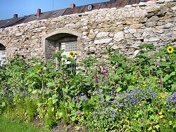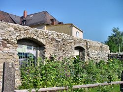 Als Wunsiedel im Jahr 1326 von Burggraf Friedrich IV. Stadtrechte verliehen bekam, war damit auch das Recht auf Erbauung einer Stadtmauer verbunden. Als um 1427 die Gefahr der Hussiteneinfälle wuchs, musste auf Anordnung des Landesherren eine doppelte Stadtmauer im Osten und Südosten der Altstadt errichtet werden mit einem vorgelagerten Graben. Die Mauer wurde aus Wunsiedler Marmor (Kalkstein) erbaut, dem Material, das man beim Aushub vorfand. Seit dieser Zeit schrieben die alten Autoren von der „Stadt mit den marmelsteinernen Mauern“. Im Jahr 2002/03 hat die Stadt Wunsiedel die Stadtmauer mit seinem Umfeld wieder in einen ehrwürdigen Zustand versetzen lassen. Das Foto zeigt einen Teil der restaurierten Stadtmauer am Ludwig-Hacker-Platz in Wunsiedel in der Nähe des Regenbogenbrunnens.