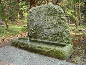 Blauer Kösseinegranit aus dem Fichtelgebirge Das Fichtelgebirge gehört zu den Mittelgebirgen Deutschlands und liegt im Nordosten Bayerns. Es gliedert sich morphologisch in einen aus mehreren Gebirgszügen zusammengesetzten, hufeisenförmig gelagerten Gebirgsstock. Im wesentlichen sind zu nennen das Zentralmassiv mit Schneeberg, Ochsenkopf und Kösseinestock, der nördliche Waldstein- und Kornbergzug und der südliche Teil mit Steinwald, Reichswald und Kohlberg. Anteil am Fichtelgebirge haben die Landkreise Tirschenreuth, Bayreuth, Kulmbach, Hof und Wunsiedel. Im Nordosten des Fichtelgebirges schließt sich das Erzgebirge, im Südosten der Oberpfälzer-, Böhmer- und Bayerische Wald an. Nordwestlich lassen sich der Frankenwald und Thüringer Wald geologisch klar abgrenzen. Im Südwesten schließt sich das morphologisch völlig andere Fränkische Bruchschollenland an. Das Fichtelgebirge ist ein "Granitgebirge" mit Höhen über 1000m, von einem Mantel älterer kristalliner Schiefer umgeben und durchsetzt, im Süden von Vulkansystemen verschiedener Perioden mannigfach durchbrochen. Der Granit (von lateinisch granum = Korn) nimmt 39% der Fläche des Fichtelgebirges ein, er ist das charakteristische Gestein, da er die höchsten Erhebungen aufbaut, dem Gebirge seine ernste Eigenart verleiht und die Grundlage eines bedeutenden Industriezweiges geworden ist. Die einzelnen Fichtelgebirgs-Granite beschreibt der Fachmann als Porphyrgranit des Weißenstadt/Liebensteiner Massivs; Reutgranit (bei Gefrees), Selber Granit, Holzmühlgranit (bei Marktleuthen), Steinwaldgranit und Friedenfelser Granit. Eine Besonderheit ist der Kösseine-Kerngranit, er hat zahlreiche Einschlüsse: Hornfelse, zentimeter große biotitreiche Nebengesteinsfetzen und -knollen, abgerundete bis rundliche quarzfeldspatreiche Einschlüsse. Die Vorkommen im Kösseinestock sind ein schmales Band am Nord-, Ost- und Süd-Rand, im Kleinen Felsen-Labyrinth der Luisenburg, im ehemaligen Steinbruch bei Kleinwendern, bei den Felsengruppen Hirschensprung, Wolfstein, Hohenstein, Ochsenkopf und Hundslohe am Kösseinefuß im nördlichen Landkreis Tirschenreuth. Abgebaut wird der „Blaue Kösseinegranit“, wie er im Steinfachhandel bezeichnet wird, noch in zwei Steinbrüchen bei Schurbach, einem Ortsteil der Stadt Waldershof. Welche herausragende Bedeutung der „blaue Kösseinegranit“ früher bei der Anfertigung von Denkmälern und Bauwerken gehabt hat, sei an einigen Beispielen erläutert: Fassade des Berliner Filmpalastes, Kaiser-Friedrich-Denkmal und verschiedene Brunnen in Berlin, Verwaltungsgebäude in Bremen, Essen, Mannheim und Frankfurt, Hauptbahnhof in München, Prinzregentendenkmal in Nürnberg. Aber auch in Luxemburg, Buenos Aires Montevideo, Madrid, in Budapest und in Los Angeles findet man blauen Granit von der Kösseine im Fichtelgebirge. Im Buch von Jörg Hüttner „Der Fichtelgebirgsgranit – Werkstoff einer Region“ (Herausgegeben vom Fichtelgebirgsverein) kann man Einzelheiten über das oberpfälzer Steinmaterial von der Kösseine nachlesen. Und bei einem Besuch im Unterkunftshaus des Fichtelgebirgsvereins auf der Kösseine kann man im Hausflur den geschliffenen und gut verarbeiteten blauen Kösseinegranit bewundern. Am Südhang der Kösseine liegt die Quellfassung des Kösseinebrunnens. Man erreicht ihn auf dem Steinwaldwaldweg (Markierung weiß-rot) vom Weiler Kössain zum Kösseinegipfel. Die Brunnenanlage aus blauem Kösseinegranit wurde 1986 als Gemeinschaftswerk von den Ortsgruppen Brand/Opf., Ebnath und Neusorg des Fichtelgebirgsvereins geschaffen. Im Steinbruch der Firma Popp, Schurbach (Stadt Waldershof) Ruheplatz am Kösseinebrunnen Der Kösseinebrunnen