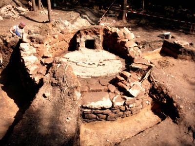 Temperaturen von etwa 400° C zur Erzeugung von Teer. Der Boden des Ofens besitzt eine konische Vertiefung mit Ablauf, über welcher eine Kuppel gemauert wurde. Um diese wurde ein zweiter Mantel aufgezogen. Wird nun das Innere mit Kienholz befüllt und außen herum die Glut über ein Schürloch kräftig entfacht, beginnt die Trockendestillation. Dann wird alle zwei Stunden minderwertiges Holz nachgelegt, wobei das Verhältnis ungefähr zwei Teile Schwelholz und ein Teil Brennholz beträgt. Bei Beginn der sogenannten exothermen Phase ab 270° C, wenn also Zellulose und Lignin sich verwandeln, entsteht der Holzteer und auch Holzgas. Das Holzgas unterstützt jetzt den Verschwelungsprozess, indem es im Verbrennungsraum verbrennt. Durch die Rinne fließen dann in bestimmter Reihenfolge, je nach Steigerung der Temperatur, die Produkte in das Auffanggefäß. Nach ungefähr sechs bis sieben Tagen ist der Prozess im Teerofen beendet und er kühlt dann weitere 14 Tage ab. Danach wird das Setzloch geöffnet und die Holzkohle herausgeholt. Bei diesem Prozess gewinnt man z. B. beim Einsatz von 13 m3 Holz ca. 140 l reinen Teer und als Nebenprodukt ca. 2000 kg beste Holzkohle. Die ersten Öfen dieser Art sind schon 1368 in einer Klageschrift der Bürger zu Eger gegen Albrecht Nothaft von Thierstein an Kaiser Karl IV. erwähnt. „Und hat in des Reichs forst geleget vir Hemer mit eckern, mit wisen, die er in den Forst gereutet hat, und funfczehen pechöfen umb Leuken.“ So lag die Vermutung nahe, dass der Fuchs vielleicht einen dieser fünfzehn Öfen gefunden hatte. Vom 18. April bis zum 6. Mai 2005 sollte dies nun durch eine archäologische Grabung unter Einbindung der Schüler in der Projektwoche der Hauptschule und ehrenamtlichen Helfern untersucht werden. Dafür konnte als studentische Fachkraft Herr Martin Sedivy von der Universität Pilsen gewonnen werden, so dass die Grabung durch ein deutsch-böhmisches Team geleitet wurde. Die Grabungsleitung hatte Herr Michael Jandejsek von der Universität Bamberg. Cirka 2200 Stunden wurden von den Schülern und den ehrenamtlichen Helfern aufgebracht um dieses Projekt zu verwirklichen. Hier nun der Kurzbericht des Grabungsleiters: Kurzbericht über die Ausgrabung eines neuzeitlichen Theerofens im Egertal bei Selb im Rahmen der Projektwoche 2005 (Unterrichtsprojekt: „Geschichte erleben“) der Hauptschule Selb Im Folgenden werden in einem ersten Kurzbericht die Ergebnisse der Ausgrabungen eines Theerofens im Egertal bei Selb im Rahmen der Projektwoche 2005 (Unterrichtsprojekt „Geschichte erleben“) der Hauptschule Selb erläutert. Die in Klammern stehenden Ziffern beziehen sich auf die Rekonstruktionszeichnung des Theerofens (s. u.). Beim Bodenabtrag stellte sich schnell heraus, dass es sich um einen Baubefund handelt, der abgesehen vom Versturz des Steinmaterials noch sehr gut erhalten war. Die abgelegene Fundstelle in der Waldabteilung Pfarrweiher dürfte dazu beigetragen haben, dass kein Steinmaterial im großen Stil abgetragen wurde. Nach dem Freilegen der Bodenplatte mit dem Ansatz einer Ablaufrinne sowie großflächigen Teerresten auf der Bodenplatte selbst und einem Auslauf an der Außenseite des Befundes konnte dieser zweifelsfrei als Theerofen identifiziert werden. Bei dem ergrabenen Theerofen handelt es sich um einen Zweikammerofen. Der Außendurchmesser beträgt 5,00 m. Das Mauerwerk (1) besteht aus Granitsteinen unterschiedlicher Größe, die in Lehm gesetzt sind. Die Mauerstärke schwankt zwischen 0,85 und 0,90 m. Da im Versturzmaterial innerhalb und außerhalb des Ofens kleinteiliges Steinmaterial weitgehend fehlte, ist ein Theerofen in Form einer Halbkugel auszuschließen. Vielmehr dürfte es sich um die Form eines abgeschnittenen Kegelstumpfes gehandelt haben, in dessen Mitte die Innenkammer nach oben herausragte. Im oberen Bereich der Außenmauer dürften Luftlöcher vorhanden gewesen sein, um den Brennprozess in der Außenkammer (2) zu steuern. Nach innen schließt sich die Außenkammer (2) in Form eines Schürringes an. Dieser besitzt eine Breite von 0,3 bis 0,6 m, wobei die Breite zum Setzloch (6) hin, das an der Westseite des Ofens liegt, zunimmt. Im Schürring wurde die notwendige Temperatur erzeugt, um die Verschwelung des Holzes in der Innenkammer (3) in Gang zu setzen. Das Setzloch weist im Bodenbereich einen Spalt von 0,07 bis 0,08 m auf. Hier konnte mittels einer Eisen- oder Tonplatte der Zugang zum Schürring verschlossen werden. Aus dem Versturzmaterial nahe des Setzloches konnte ein Steinsturz von rund 0,9 m Länge geborgen werden, der sicherlich den oberen Abschluss desselben bildete. Aufgrund der erhaltenen Länge kann eine Breite des Setzloches von rund 0,6 m angenommen werden. Gegenüber des Setzloches liegt das Kohlloch auf der Ostseite des Ofens. Zur Außenseite hin ist es aus Granitplatten, zur Innenseite hin in Ziegeln (0,26 x 0,13 x 0,06 m) ausgeführt. Es besitzt einen quadratischen Querschnitt von rund 0,4 m. Über das Kohlloch konnte die vom Verschwelungsprozess übrige Holzkohle ausgeräumt werden. Die Innenkammer (3) war in Ziegelbauweise ausgeführt, von der sich kein aufgehendes Mauerwerk erhalten hat. Zahlreiche Ziegelfunde aus dem Versturzmaterial im Innenbereich des Ofens weisen auf der einen Seite eine starke Schwärzung, auf der anderen Seite Pechanhaftungen auf. Zudem steht die in Ziegeln ausgeführte Innenseite des Kohlloches rund 0,12 bis 0,13 m auf der Bodenplatte, was der ermittelten Ziegelbreite entspricht. Die Bodenplatte mit einem Außendurchmesser von rund 2,4 m ist ebenfalls in Ziegel (0,26 x 0,13 x 0,06 m) ausgeführt und weist z. T. großflächige Teerreste auf. Auffällig ist, dass die Westhälfte der Bodenplatte abgetragen ist, aber auch hier großflächige Teerreste anhaften. So wurde der Ofen trotz beschädigter Bodenplatte weiter betrieben. Im Zentrum der Bodenplatte findet sich ein annähernd quadratischer, konisch gewölbter Granitstein, der den tiefsten Punkt der Bodenplatte bildet. D