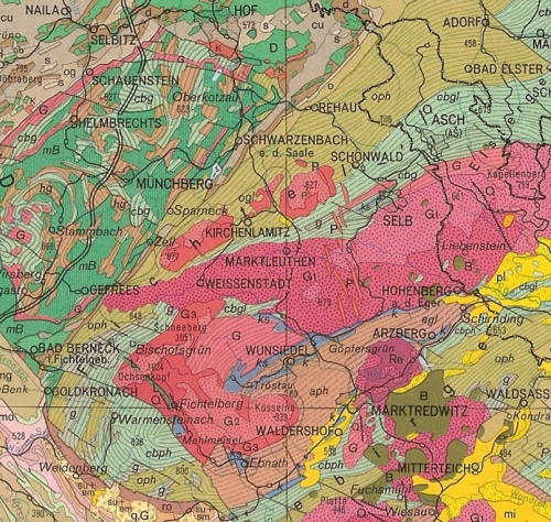 Abb. 1: Geologische Karte des Fichtelgebirges; rechts oben Asch und der Hainberg.