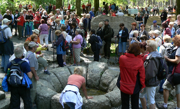 Der Flusslauf Eger verbindet Deutschland und Tschechien. Am 29. Mai 2011 trafen sich Wanderer aus Deutschland und Tschechien an der Egerquelle im Fichtelgebirge. Tschechen und Deutsche feiern gemeinsam an der Egerquelle Die Eger, die im Fichtelgebirge bei Weißenstadt entspringt, durchfließt eine vielfältige völkerverbindende Kulturlandschaft. Durch die vorhandenen Radwege und Wanderwege, die von den deutschen Kommunen, vom Fichtelgebirgsverein sowie vom Klub Tschechischer Touristen geschaffen wurden, besteht bereits eine enge Zusammenarbeit und ein interessantes Angebot, das erweitert werden soll. In dem tschechischen Verband der Gemeinden zwischen Leitmeritz und Karlsbad sowie dem Landkreis Wunsiedel wird derzeit ein grenzüberschreitender Egerradweg von der Quelle bis zur Mündung in Litoměřice (Leitmeritz) geplant. Der Tourismusverband Nieder-Egertal mit Sitz in Saaß/CZ organisiert eine Veranstaltungsreihe wegen der Erstnennung des Egerflusses vor 1210 Jahren. Der Flussname Eger wird erstmalig im Jahr 805 im Chronicon Moissiancense als „Agara“ genannt. Die Chronik ist eine mittelalterliche Handschrift in lateinischer Sprache, in der nach Jahren geordnet Ereignisse aus dem Fränkischen Reich niedergeschrieben wurden. Als weitere frühe Belege für den Flussnamen führen Sprachwissenschaftler die Formen 1165 „aqua Egre, Oegre“ an. Der älteste bekannte Beleg, der sich eindeutig auf den Namen des Flusses Eger im Bereich des hochmittelalterlichen Egerlandes bezieht, ist 1348 „z dem Staine an der Eger“. Der mit dem Flussnamen identische Ortsname Eger wird erstmals in einer im Original vorliegenden Urkunde Heinrichs IV. aus dem Jahr 1061 als „Egire“ erwähnt. Der Name soll prägermanischer Herkunft sein und zur indogermanischen Wurzel gehören und so viel wie „treiben, in Bewegung setzen“ bedeuten. Die tschechische Namensform lautet heute „Ohře“. Die erste Veranstaltung findet am 18. April 2015 um 13.30 Uhr an der Egerquelle bei Weißenstadt statt, wo eine Quellen-Segnung gehalten wird. Am 27. Juni 2015 findet die Hauptfeier in Kadaň (Kaaden) mit einem Mittelaltermarkt statt und am 24. Oktober 2015 trifft man sich in Litoměřice zur Schlussveranstaltung. Dietmar Herrmann Weihe der Egerquelle mit zahlreichen Gästen aus der Tschechischen Republik 18. April 2015 ![]() Für viele Bewohner des Egertals auf tschechischer Seite hat die Egerquelle eine Art mystische Bedeutung, auch weil sie so lange unerreichbar war. Geistliche beider Länder haben die Quelle am 18. April 2015 gesegnet und dies in einen Zusammenhang mit der deutsch-tschechischen Nachbarschaft gestellt, weil der Fluss beider Länder verbindet. Für den Fichtelgebirgsverein haben Heinrich Henniger und stellv. Hauptvorsitzender Jörg Nürnberger auf tschechisch gesprochen. Das Fichtelgebirge ist ein Teil vom Dach Europas, in dem vier Flüsse entspringen, die von hier aus in alle vier Himmelsrichtungen fließen: die Saale, die nördlich von hier entspringt und in die Elbe mündet, der Main, der nach Westen fließt, bei Wiesbaden in den Rhein und in die Nordsee mündet, die Fichtelnaab, die nach Süden in die Donau und ins Schwarze Meer fließt, und die Eger, an deren Quelle wir heute stehen, die in östlicher Richtung nach Tschechien fließt und bei Leitmeritz in die Elbe und damit ebenfalls in die Nordsee mündet. Sie begehen heute an der Egerquelle eine besondere Feier: vor 1210 Jahren, im Jahr 805 wurde der Flussname Eger in einer mittelalterlichen Handschrift in lateinischer Sprache als „Agara“ erstmals benannt, in der Zeit, als das Reich Karls des Großen in voller Blüte stand. Die Eger, die hier entspringt, durchfließt eine vielfältige, völkerverbindende Kulturlandschaft. Im Tourismusverband Saaz, der das Untere Egertal betreut, sind die Gemeinden von Leitmeritz bis zur Karlsbader Bezirksgrenze zusammengeschlossen. Zusammen mit dem Bezirk Karlsbad sind sie Partner des Landkreises Wunsiedel, um auch einen grenzüberschreitenden Egerradweg von der Quelle bis zur Mündung zu gestalten. Zusätzlich werden der Fichtelgebirgsverein und der Klub Tschechischer Touristen einen binationalen Wanderweg von der Quelle bis zur Mündung ausbauen, der auch an den schon bestehenden Mainwanderweg, der von der Weißmainquelle bei Bischofsgrün bis nach Wiesbaden zur Mündung des Mains in den Rhein führt, anschließen kann. |