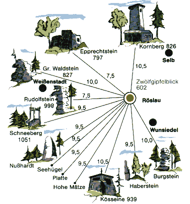 Zwölfgipfelblick Geographischer Mittelpunkt Der 602 m hohe Aussichtspunkt liegt nördlich von Röslau an der Straße nach Dürn-berg. 1953 wurde von Konfirmanden auf der Anhöhe eine kleine Parkanlage ge-schaffen; 1992 stellte die Gemeinde Röslau einen Granitfindling auf, die achteckige Steinplatte aus Kösseinegranit trägt die Inschrift "Mittelpunkt des Fichtelgebirges Röslau" und die Flussnamen Main, Saale, Eger, Naab. Es bietet sich ein schöner Blick auf den Ort Röslau und ein Rundblick zu 12 Bergen des Fichtelgebirges: Kornberg, Epprechtstein, Waldstein, Rudolfstein, Schneeberg, Nußhardt, Seehügel, Platte, Hohe Matze, Kösseine, Haberstein, Burgstein.