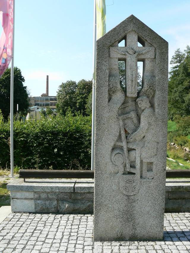 Bei einem künstlerischen Wettbewerb erhielt die Künstlergemeinschaft Melita Todorocic und Günther Mauermann aus Weiden/Opf. die Ausführung der eingereichten Kunstobjekte übertragen. Die drei Meter hohe Granitstele beinhaltet die Darstellung eines Hauswebers am Webstuhl und zeigt den Bezug zu Dörflas und seiner wirtschaftlichen Entwicklung als Webergemeinde.